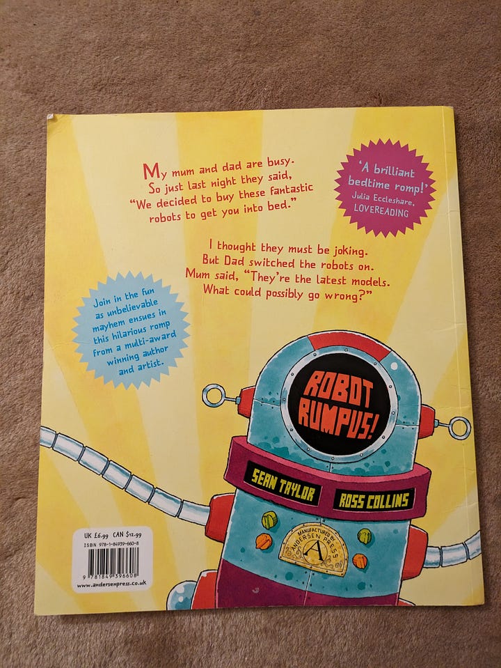 We stumbled across this book when visiting my nephews a few years ago. It was a school reading book for the Year 1s. The word “rumpus” was a new one at home after reading Where the Wild Things Are, so my son was interested in this book, and it has been one of the most read books we have! It’s silly and boisterous, and the list of the different robots on the inner covers is fantastic. We talk about Wash-bot, Cook-bot and Dry-bot many many times a week!