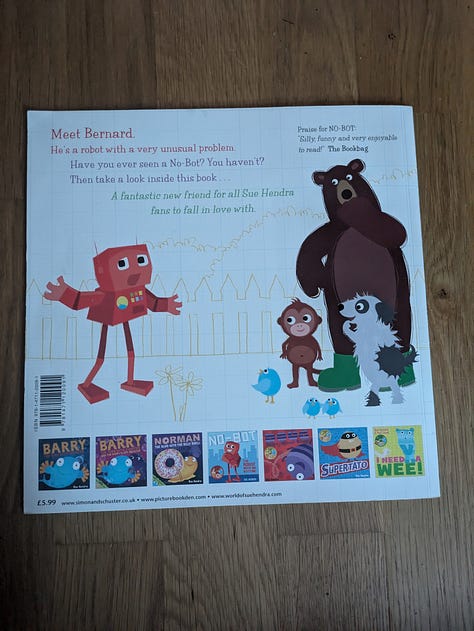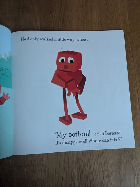 This is brand new for us. I got it as part of a bundle of second hand books and am so glad we found it. Seriously funny! This was a hit from the very first page. Bernard the robot loses his bottom on a swing. Each time he almost tracks it down, it moves on; a bird uses it in its nest, a bear uses it as a drum. So many silly situations had us laughing all the way through and then immediately reading it all over again.